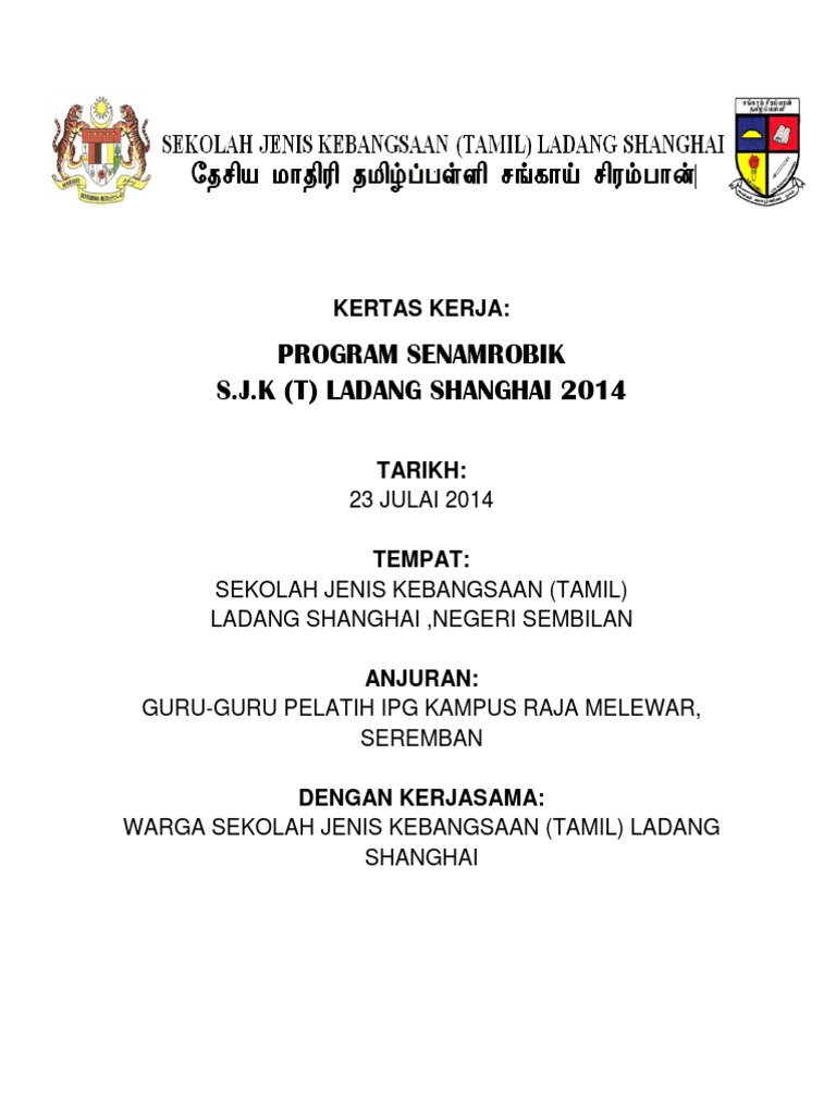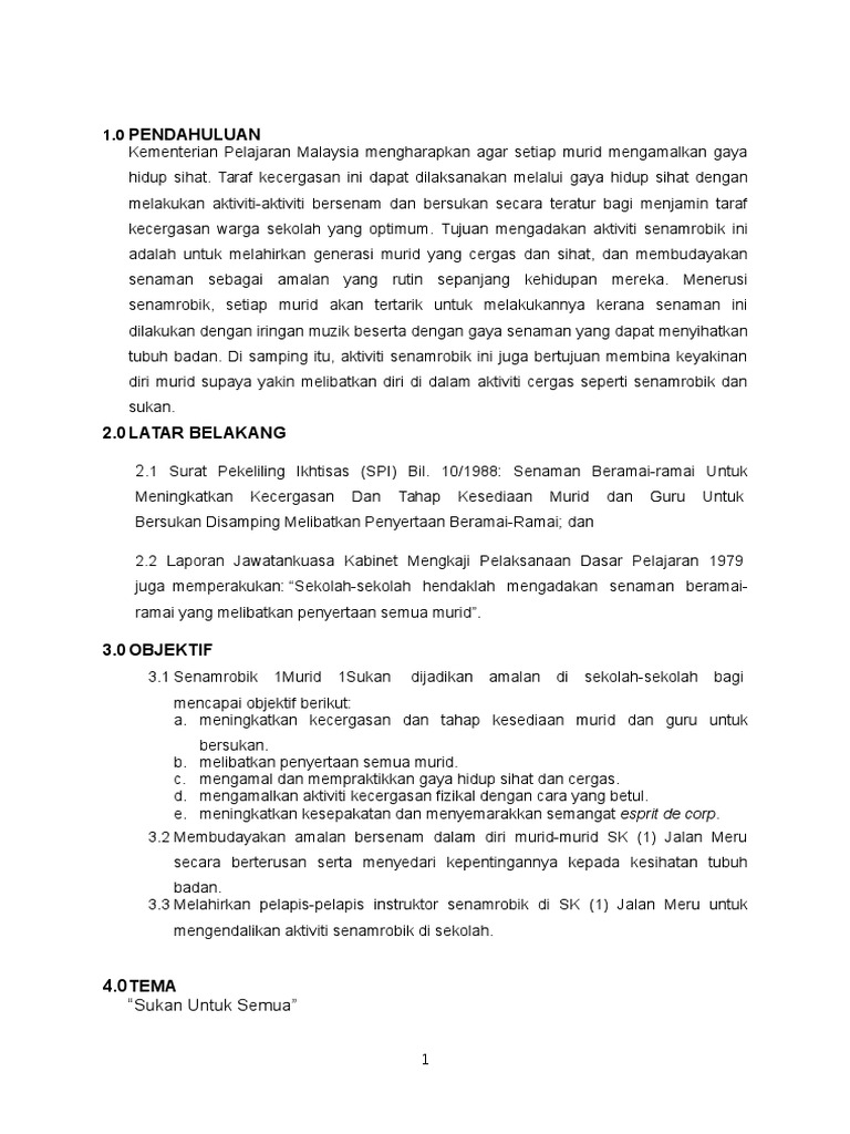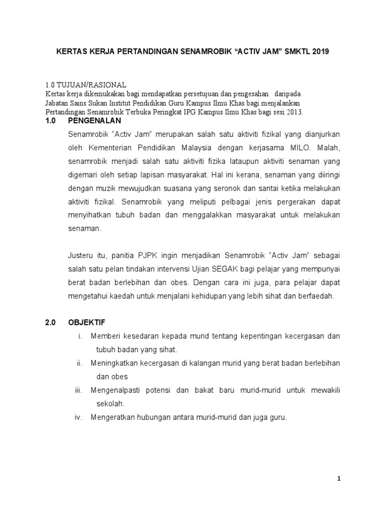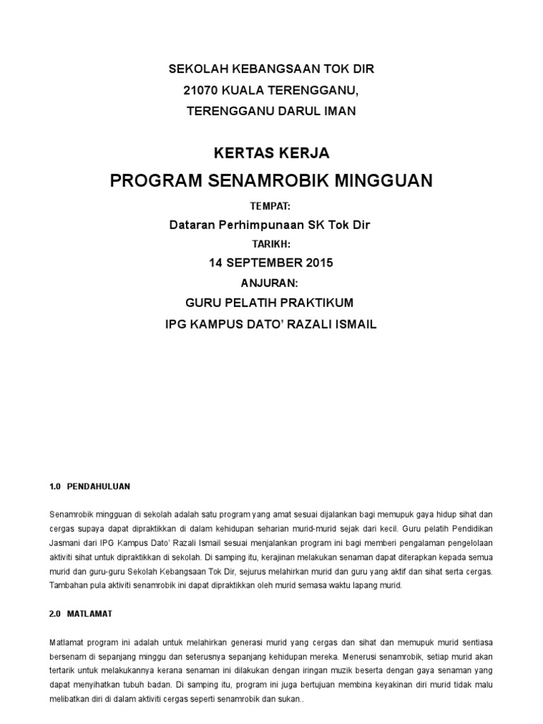 Informasi Dokumen klik untuk memperluas informasi dokumen. Kertas kerja senamrobik 1 murid 1 sukan 1 malaysia tarikh 8hb mac 2014 masa 720 pagi 850 pagi tempat dataran perhimpunan sk parit kadzi 2. Kelebihan Selepas segala perancangan diputuskan kami mula menyiapkan kertas kerja tentang persembahan senamrobik yang akan dilakukan bagi ujian amali persatuan senamrobik ini.
